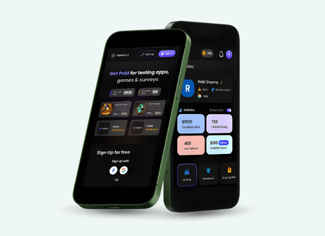 Users register and browse earning opportunities like surveys, cashback, and videos.