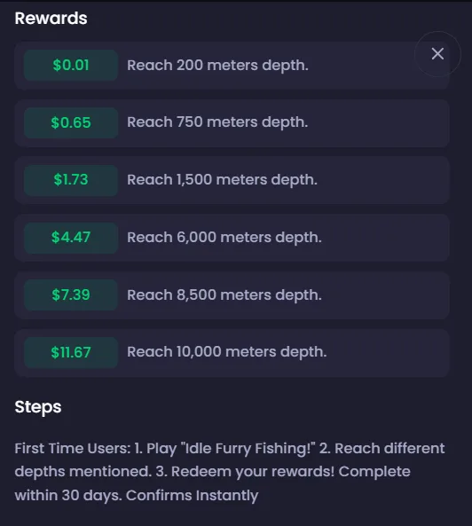 Players earn cash by reaching new depths — the deeper they go, the greater the reward, with incentives scaling up to $11.67. This not only maintains user interest but also encourages more profound engagement.