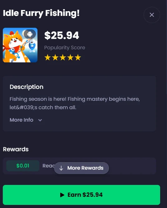 Take “Idle Furry Fishing,” for example. FreeCash doesn’t stop at app installation; it draws users back into the game with its engaging reward system.