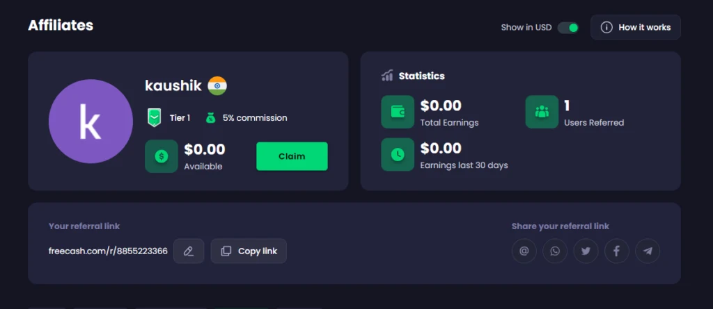 The tier-based affiliate system in the FreeCash app rewards users for referring new people to the platform. As users’ referrals earn money, the original referrer progresses through different tiers, starting from a 5% commission at Tier 1 and potentially rising to a 30% commission at higher tiers.