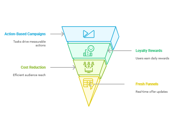 It is a marketplace interface inside apps or web platforms where users complete tasks in exchange for digital rewards. Affiliates gain a dashboard with analytics, targeting, and customization options.
